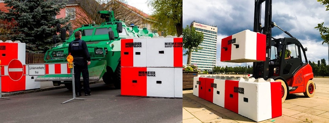 Die NIEMEIER SAFETYBLÖCKE sind kranfähig und besitzen Gabelstaplertaschen für den leichten, schnellen und flexiblen Transport. Zubehör : Gummimatten zur Erhöhung der Rutschfestigkeit, sowie „No go Area“ Absperrketten für die Fläche hinter dem Block.